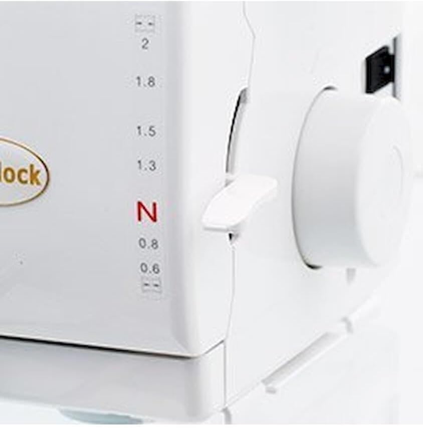 Image: Side panel of the Baby Lock Imagine, showing the rotary dial for adjusting stitch length and differential feed settings.