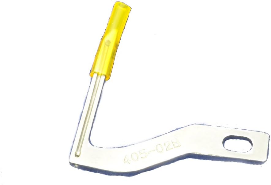 Image 1.1: The Baby Lock, Simplicity Serger Lower Looper. This metallic component features a distinct L-shape with a small eyelet at one end and a yellow protective cap covering the needle-like tip. The model number "405-02B" is visible on its surface.