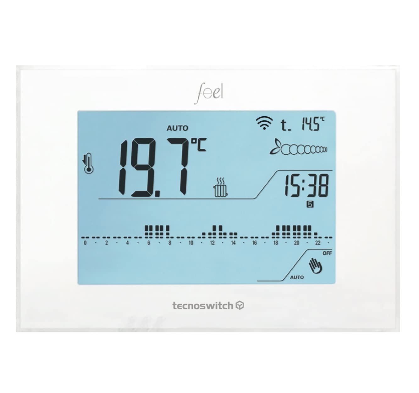 The TECNOSWITCH CR035WB is a wall-mounted Wi-Fi touch thermostat featuring a backlit LCD display. It offers daily and weekly programming capabilities for both heating and cooling modes. Remote control is available via iOS and Android applications.