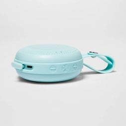 Image: The Heyday Round Portable Bluetooth Speaker in its light teal color, showcasing its compact, round design and integrated loop.