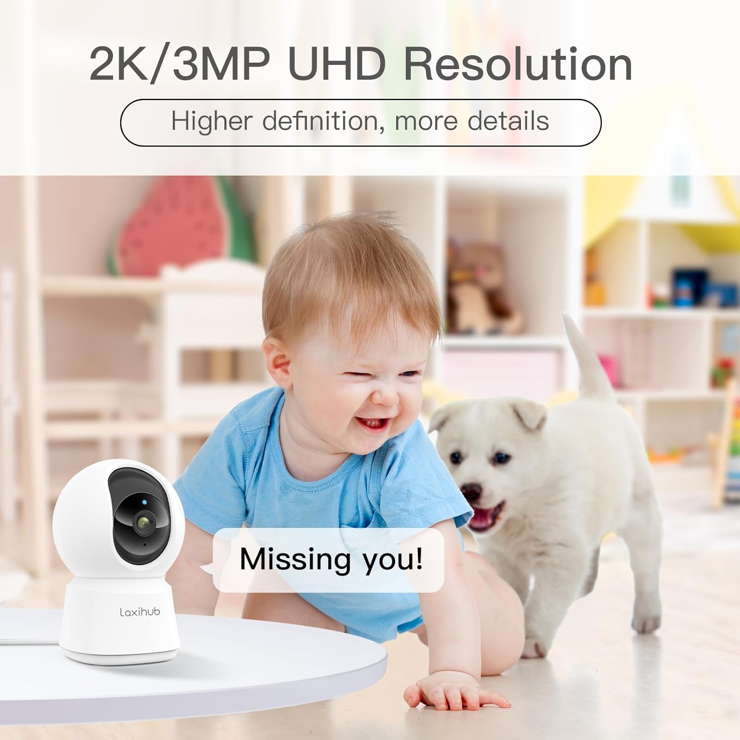 The LAXIHUB P2 is a versatile indoor security camera designed for monitoring pets, babies, or general home surveillance. It features 1080P Full HD video, 355° horizontal pan and 60° vertical tilt for comprehensive coverage, super IR night vision, motion and sound detection, and two-way audio communication. The camera is compatible with Amazon Alexa and Google Assistant for convenient voice control.