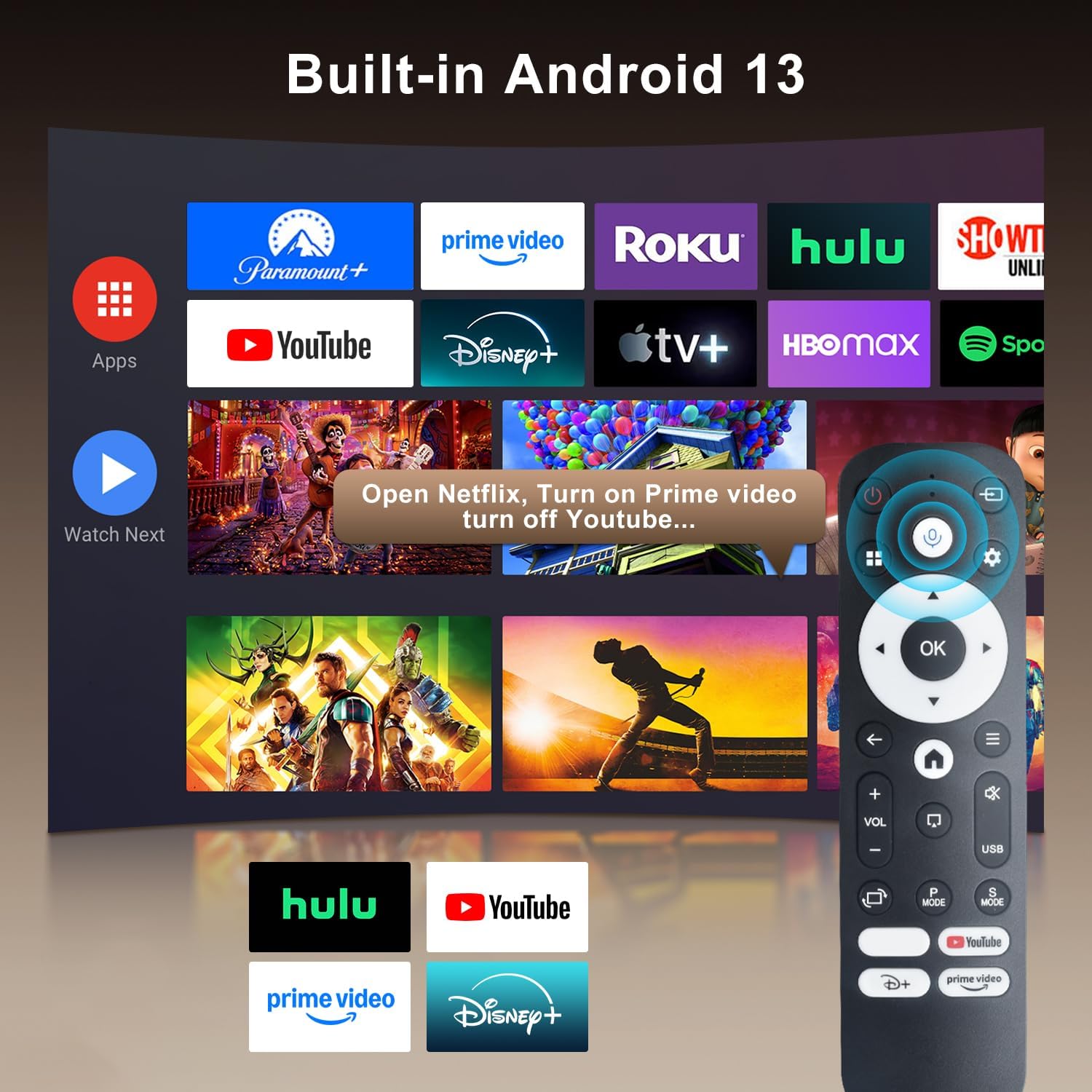 Image: The projector's interface showing built-in Android 13 apps and the Bluetooth voice remote control.