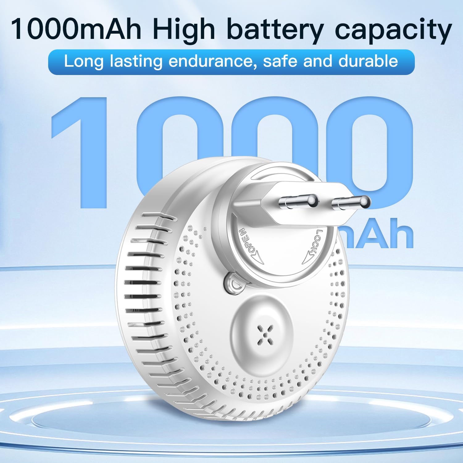 Малюнак 1: Задняя частка view of the alarm, highlighting the plug for direct wall outlet connection and the 1000mAh battery capacity.