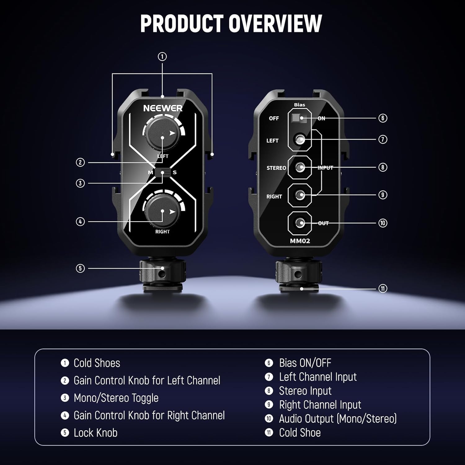 The NEEWER MM02 Dual Channel Microphone Audio Mixer Adapter is designed to enhance your audio recording capabilities for video production, vlogging, podcasts, and interviews. This compact device allows you to connect and control two microphones simultaneously, offering both mono and stereo output options. It features multiple mounting points for versatile integration with your camera setup.