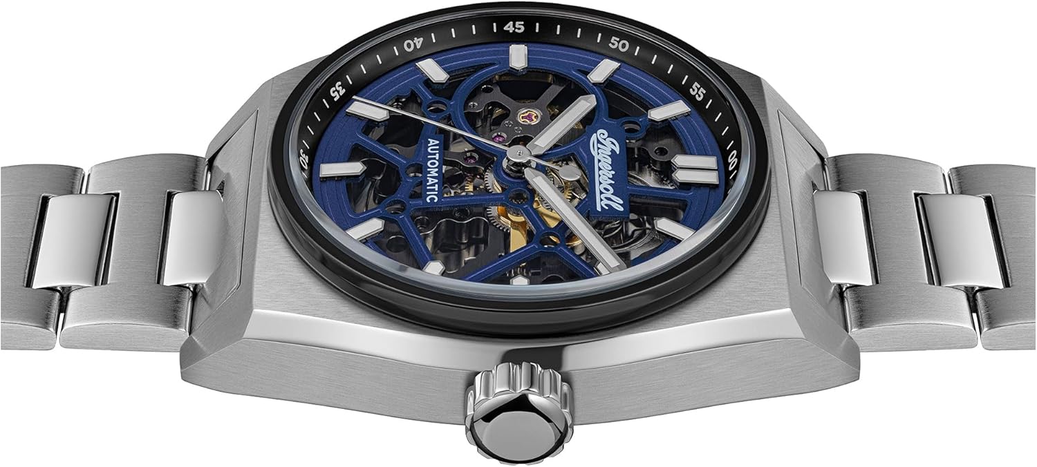 The Ingersoll The Vert is a men's automatic watch featuring a skeletonized movement, a 43mm stainless steel case, scratch-resistant mineral glass, and a stainless steel bracelet. It is water-resistant up to 50 meters.